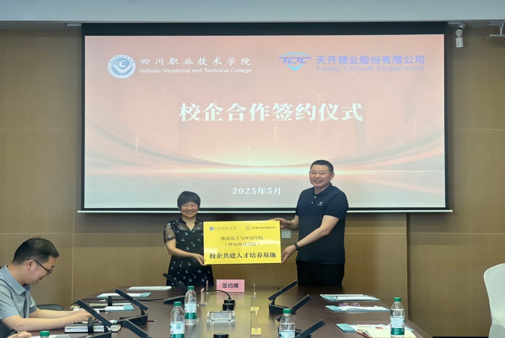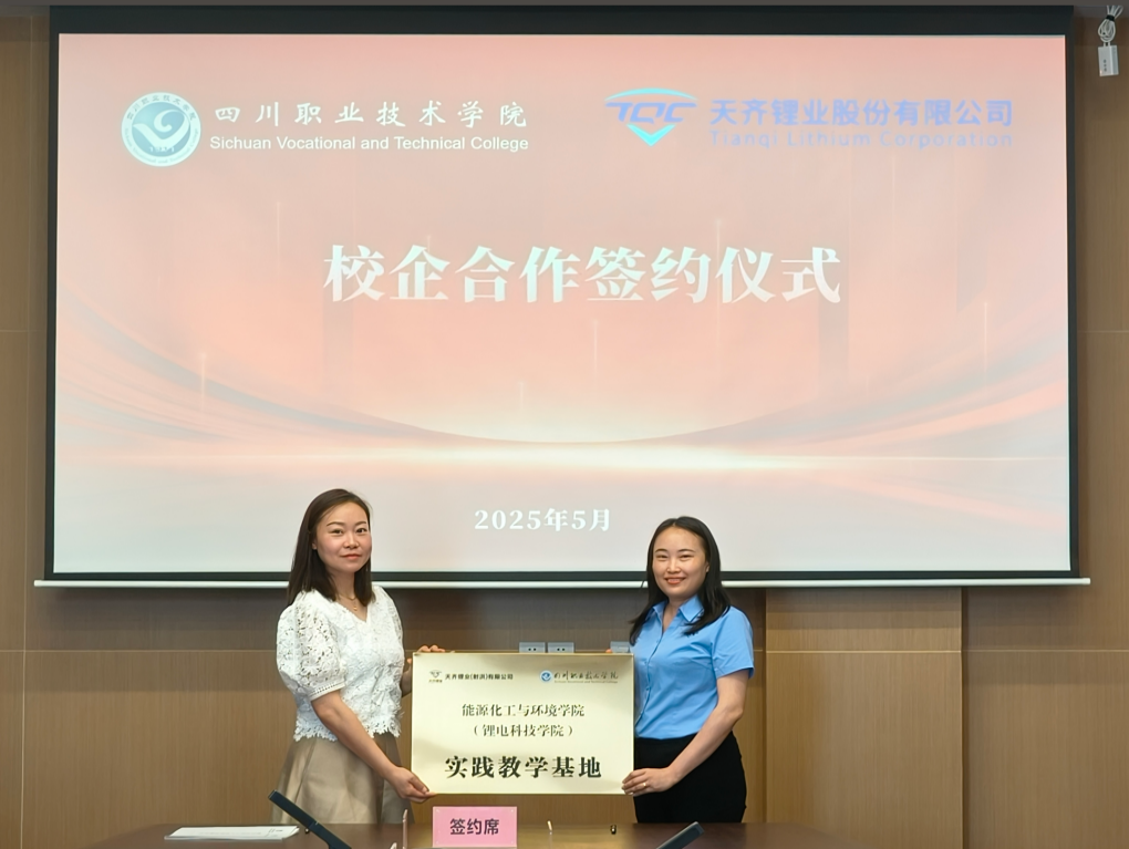 会上,双方签订了《四川职业技术学院 天齐锂业(射洪)有限公司产教融合框架协议》、《四川职业技术学院(能源化工与环境学院) 天齐锂业(射洪)有限公司校企合作人才培养实施协议》,天齐锂业为学校授予“校企共建人才培养基地”牌匾,学校为天齐锂业授予“实践教学基地”牌匾。